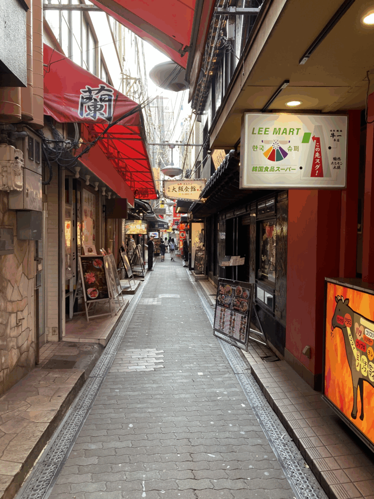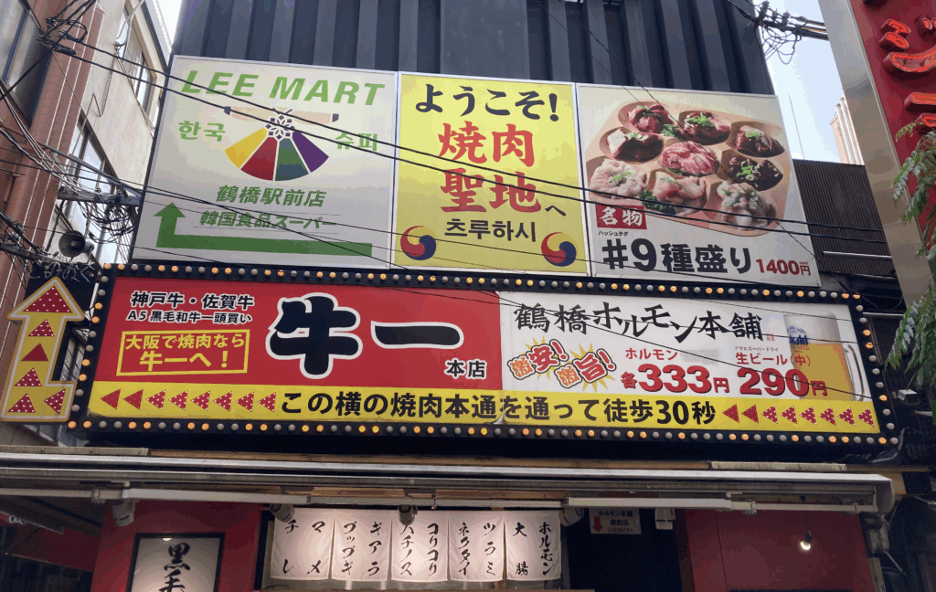 鶴橋駅から少し歩きますと、焼肉店が立ち並ぶ一角へと入ります。