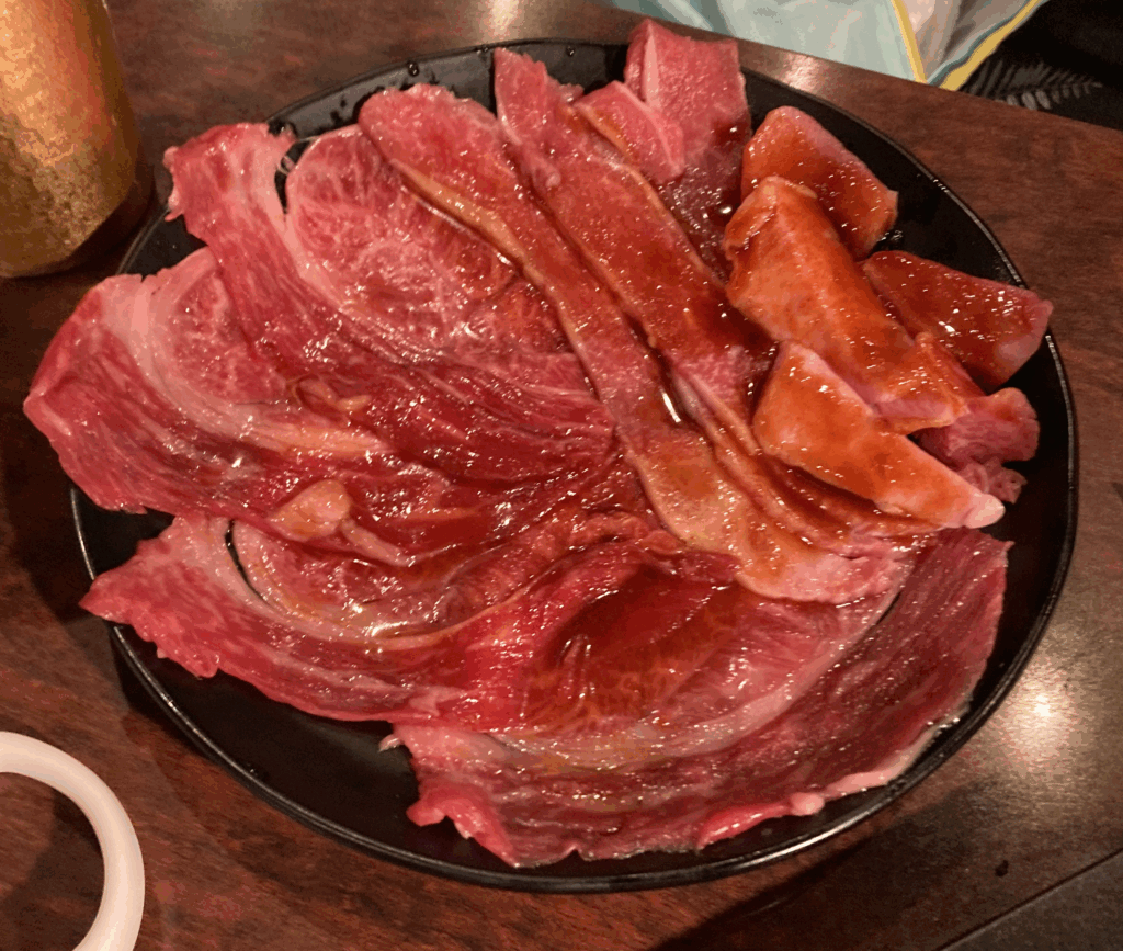 焼台にのせると、ほどよく脂がにじみ、香りがふわりと広がります。赤身でありながら柔らかさがしっかりとあり、噛むほどに旨味が真っ直ぐに広がっていくタイプのお肉でした。
