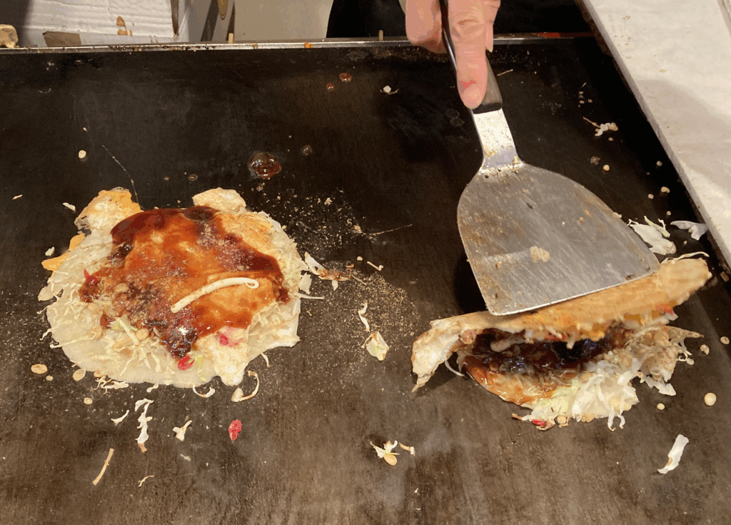 キャベツの甘みが鉄板の熱でふわっと立ち上がり、少量の油が表面を照らすように光り、焼き手のおばちゃんがくるりとリズム良く裏返す。