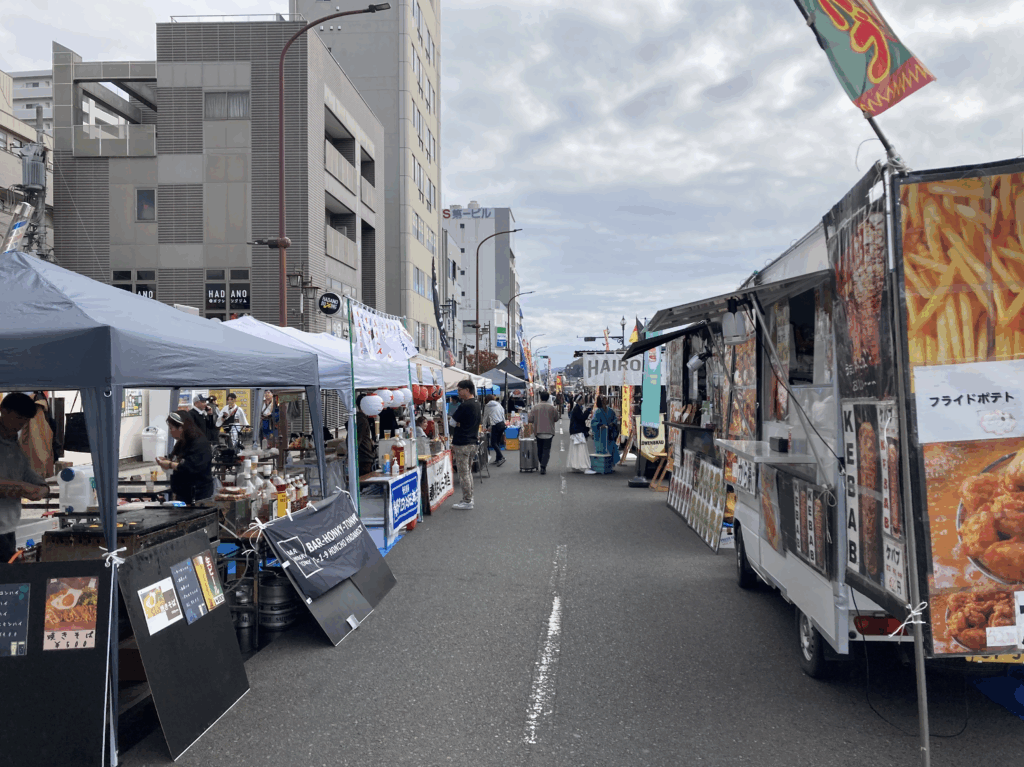 時期によりエリアが変わることもありますが、基本的には駅前商店街を中心に展開。 - 地元商店とコラボした出店が多数