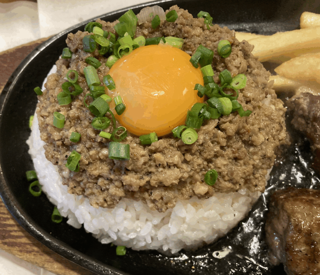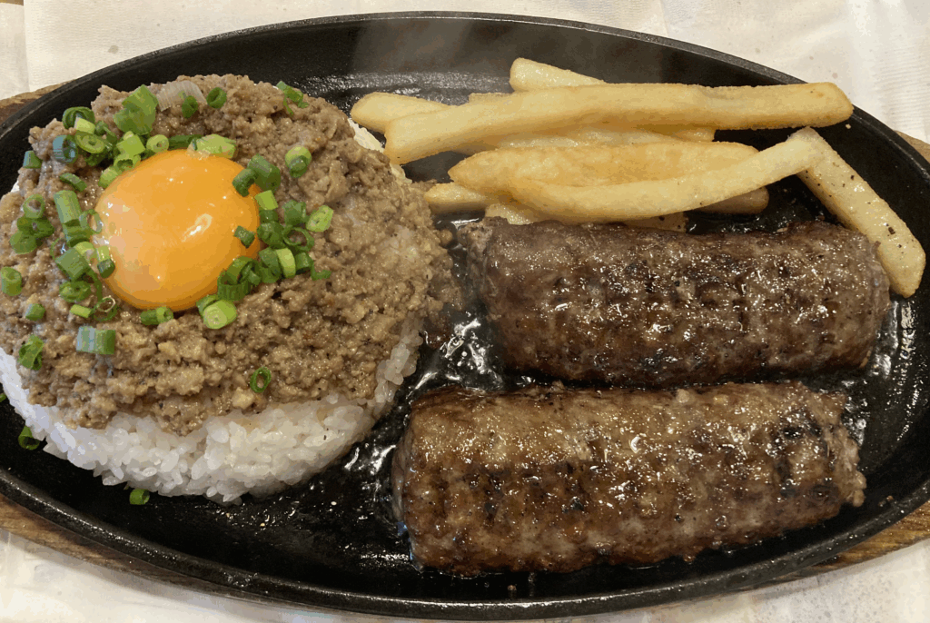 その中央にぽってり黄身が鎮座し、横には俵形の炭焼きハンバーグが二本。フレンチフライが添えられて、見た目のバランスも豪快で、いかにも「食べるぞ!」という気分にさせてくれます。