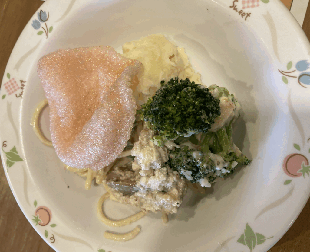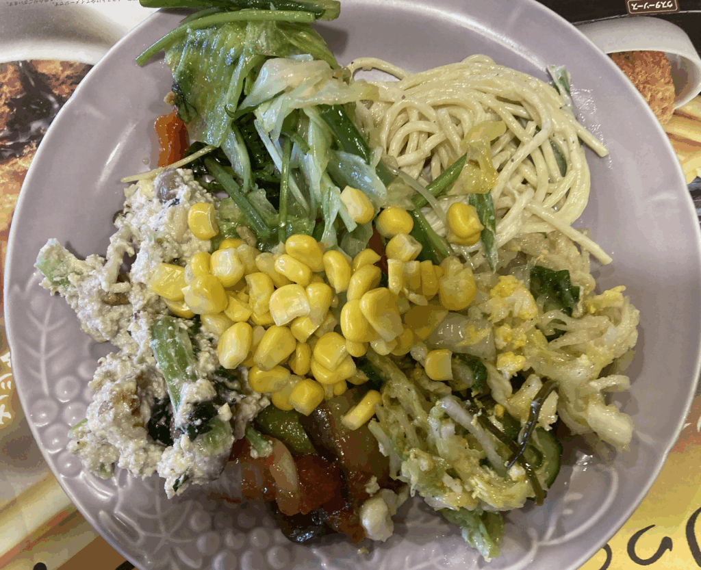 - サラダバーの野菜を活かしたヘルシー寄りの食べ方(スチーム野菜+ハンバーグ少なめ)を試してみる。