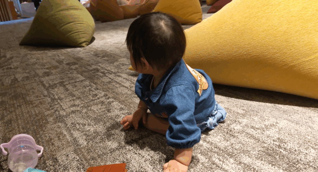 ここはクッションやソファが多く配置され、子どもが安心して這い回れるようなスペース構成になっています。