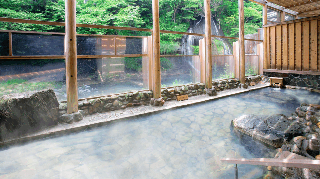 渓流を眼下に望む半露天風呂や複数の浴槽が配され、露天から聞こえる川の音や滝の気配がより自然の中にいる感覚を強めます。