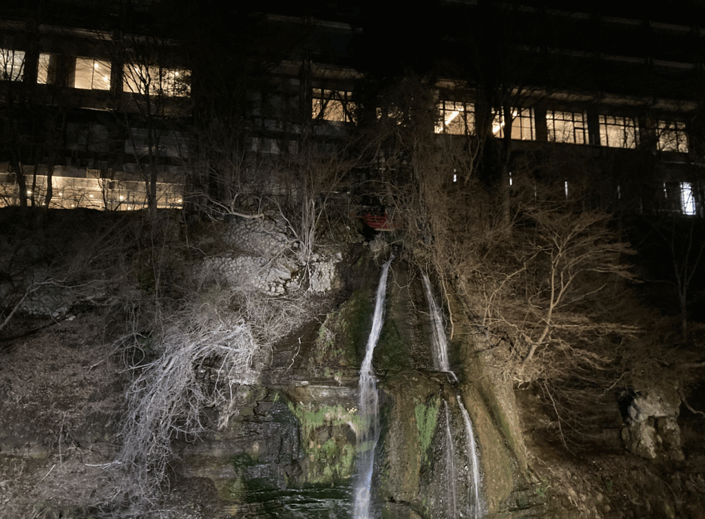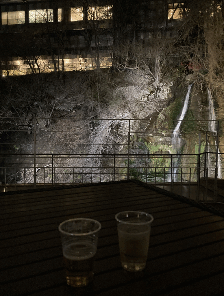 夜は照明が落ち着き、滝の音だけが効果音のように響く中で、ゆっくりと飲む時間がとても贅沢に感じられました。