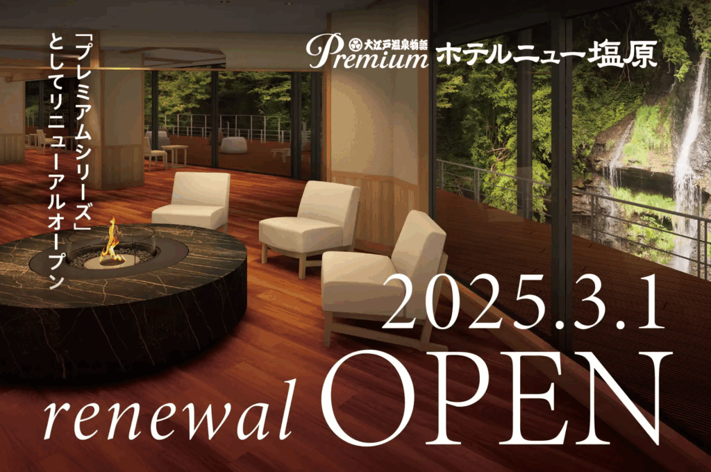 - 大江戸温泉物語 Premium ホテルニュー塩原(公式施設案内、プレミアムラウンジの紹介)。