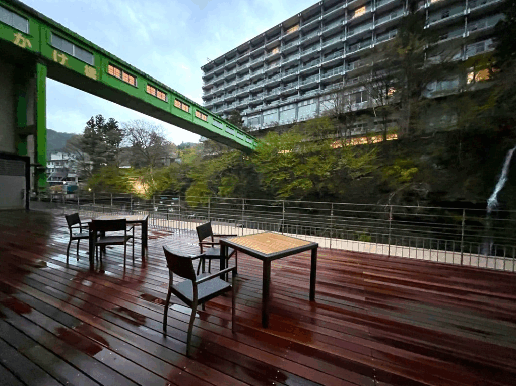 対岸の湯仙峡エリアに新設された「滝見ラウンジ」は、今回のリニューアルの目玉の一つ。