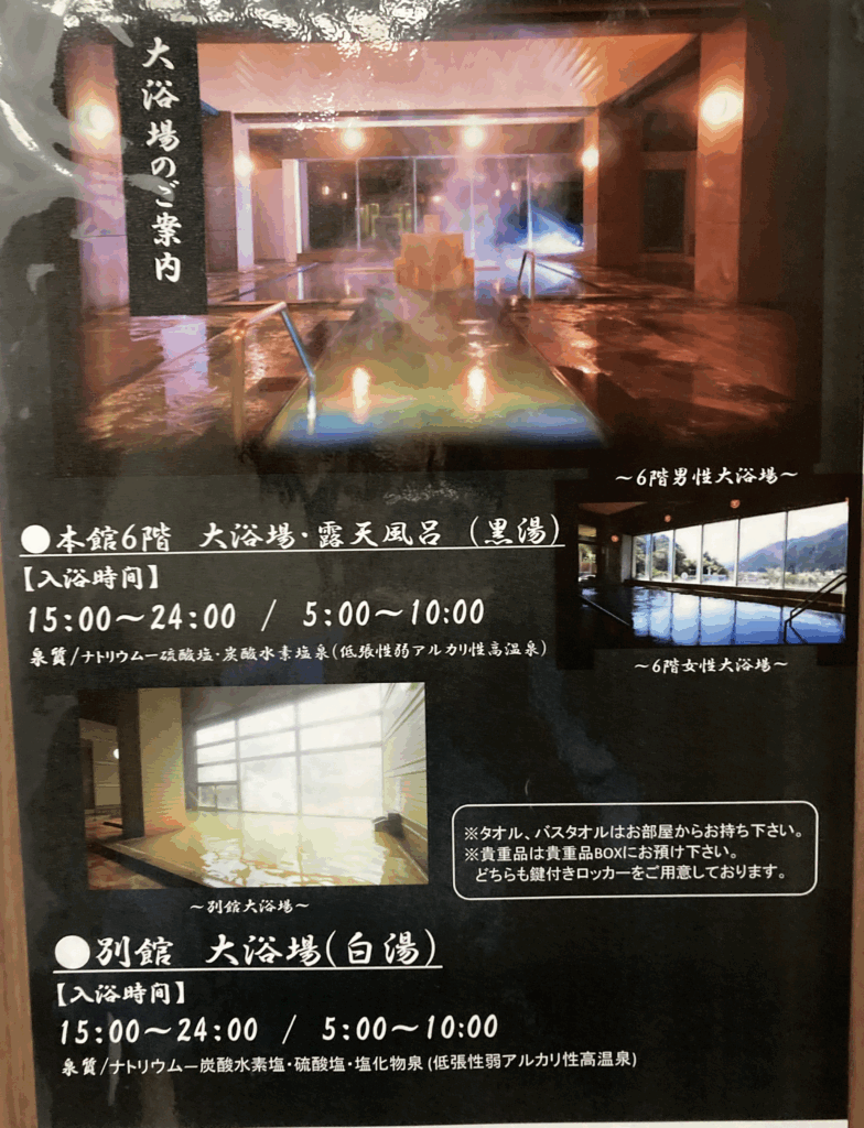 今回は1泊2食付きのプランで、18時からの夕食を楽しみにしつつ、まずは湯に向かうことにしました。