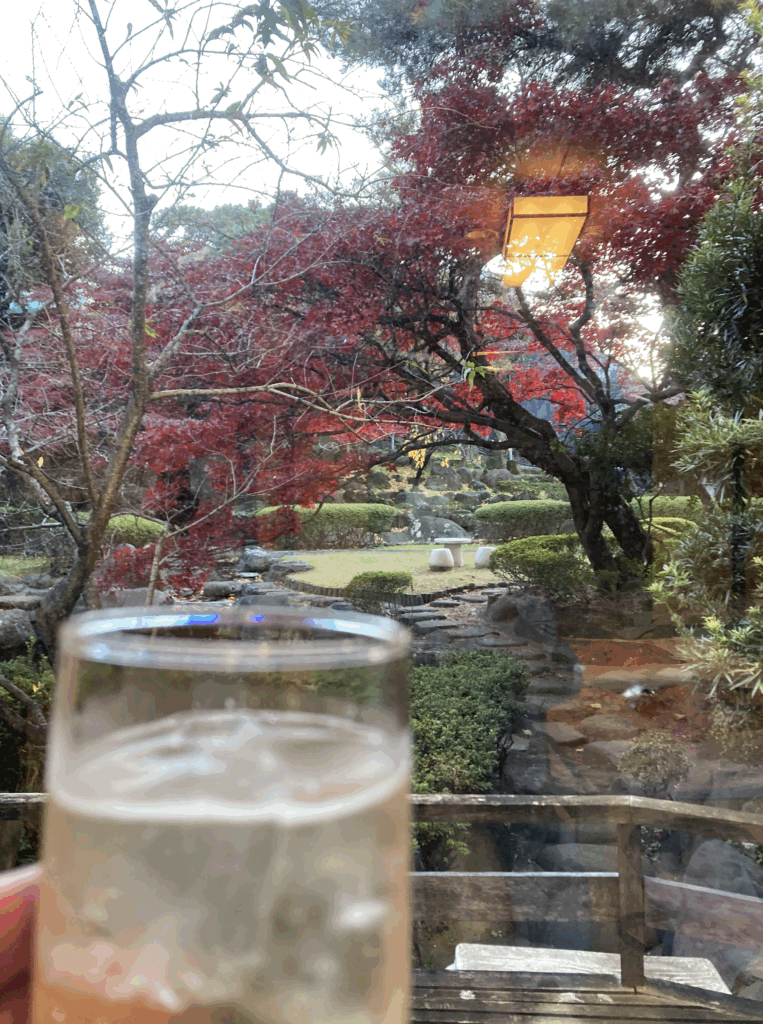 庭園の傍らでゆっくり湯上がりに一杯飲むと、旅先の雑事が溶け出していく。