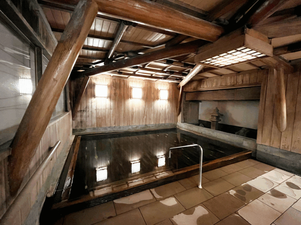檜風呂特有の木の温もりが、湯そのものの柔らかさと相まって心地よく、湯面に映る天井の陰影を眺めながら長く浸かっていられます。