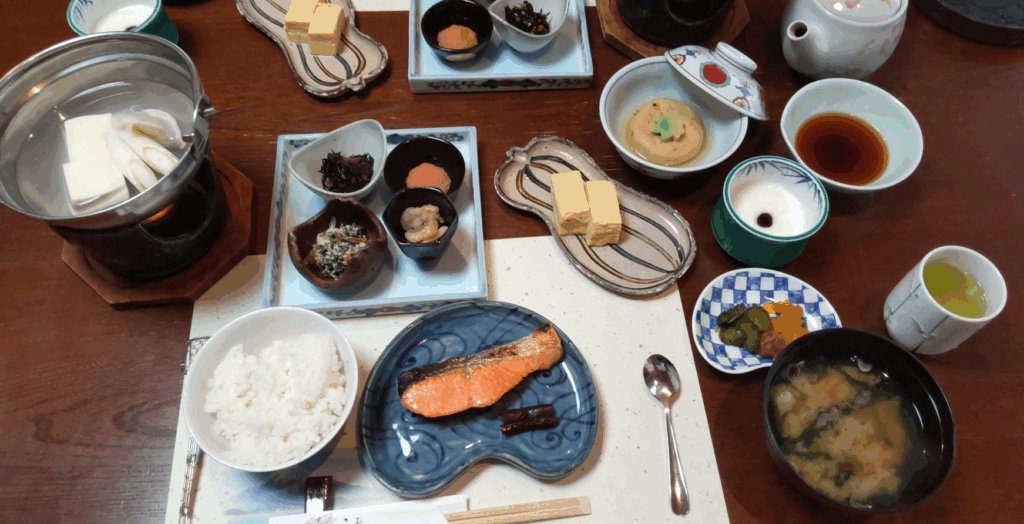 朝食会場へ向かうと、素朴で丁寧な膳が並びます。