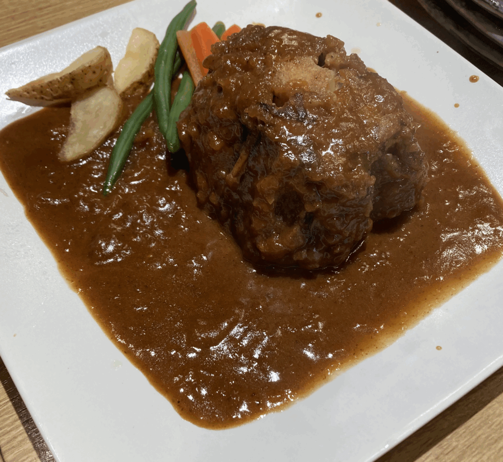 テーブルに運ばれてきたとき、まず目を引くのは「肉塊感」。まぐろの尾のボリュームは想像以上で、じっくり煮込まれた風格があります。表面は濃厚なブラウンソースに覆われ、湯気とともに立ち上る香りが「食べる前のワクワク」をしっかり煽ります。