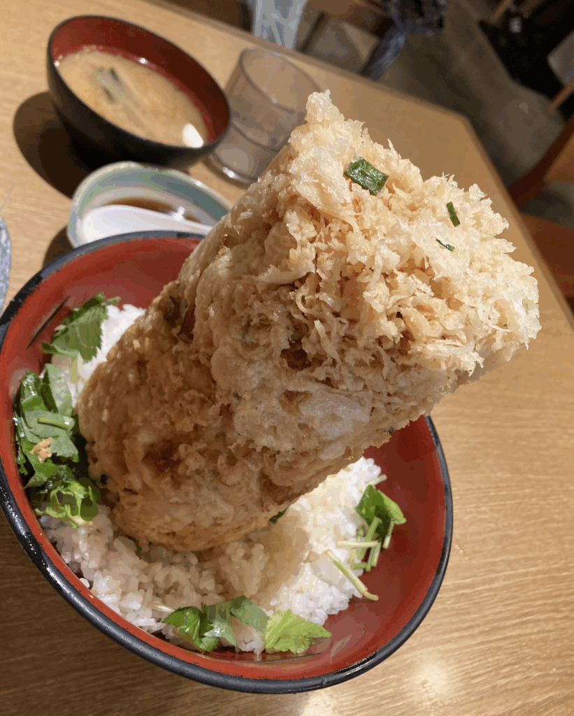 - かき揚げタワーはSNS映えするビジュアルと、実際の揚げ仕事の良さが両立。