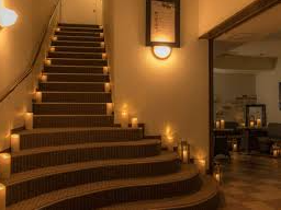 窓には泊まり客の穏やかな明かりが点在し、遠くには海に浮かぶ月の光が揺れている。
