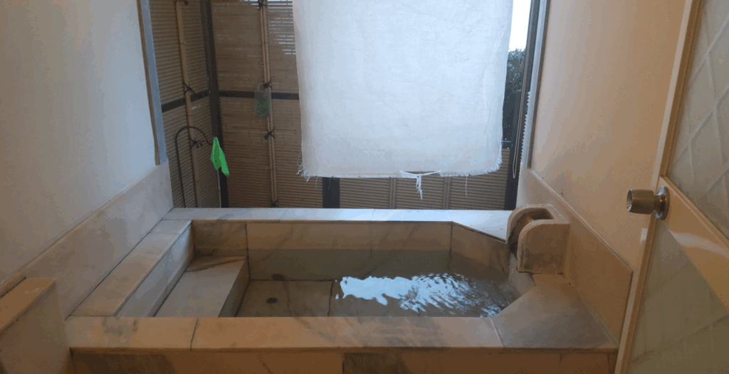 鍵を受け取り、二人で扉を開ける。石を用いた簡素で落ち着いた空間に湯が張られ、外の風が。