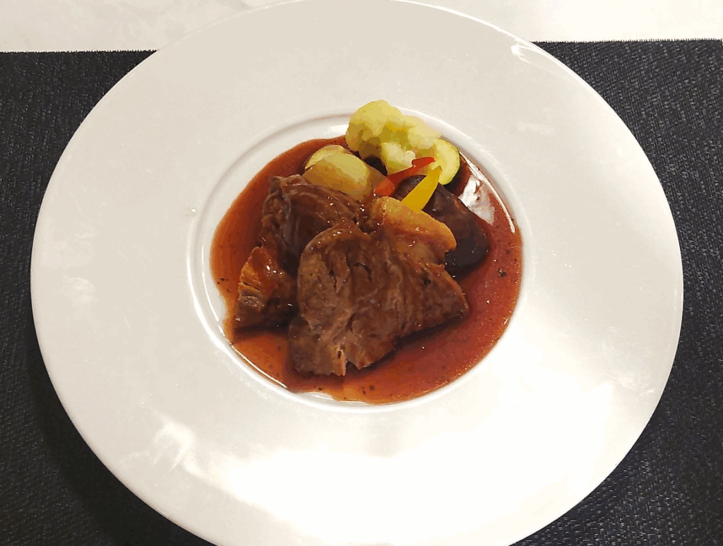 ポルト酒(ポートワイン)のソースは甘さと酸味のバランスが秀逸で、しっかりとした肉の風味に寄り添う。豚肉の脂の甘味をソースが受け止め、白ワインから赤へと移る前にしっかり満足感を得られる皿になっている。