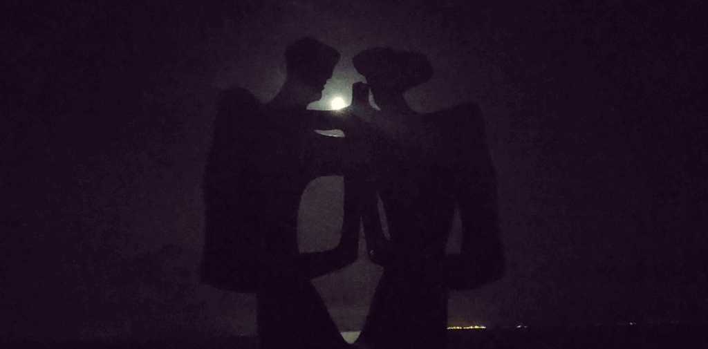夜風が頬を撫で、波の音が一定のリズムで聞こえ、像の間から見える月が美しい。