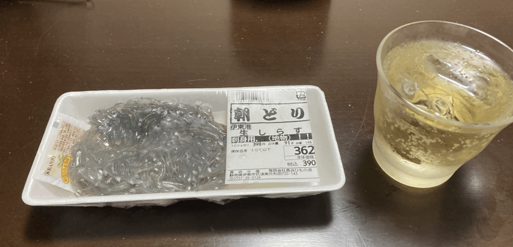 部屋の小さなテーブルには、夜の静けさの中で食べ残しの生しらすを広げ、ぶりやまんぼうと混ぜ合わせて最後のつまみに。