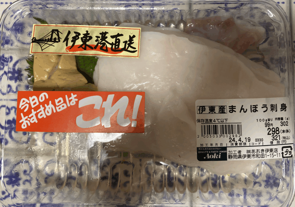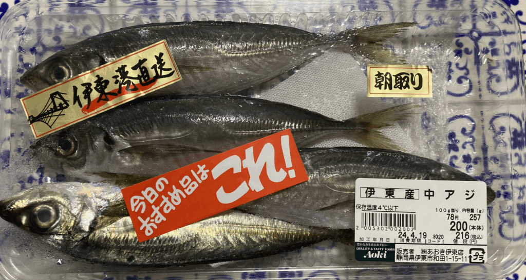 代わりに近くの「スーパーあおき」に立ち寄り、魚の売り場を物色。そこで買ったのが以下のものです。