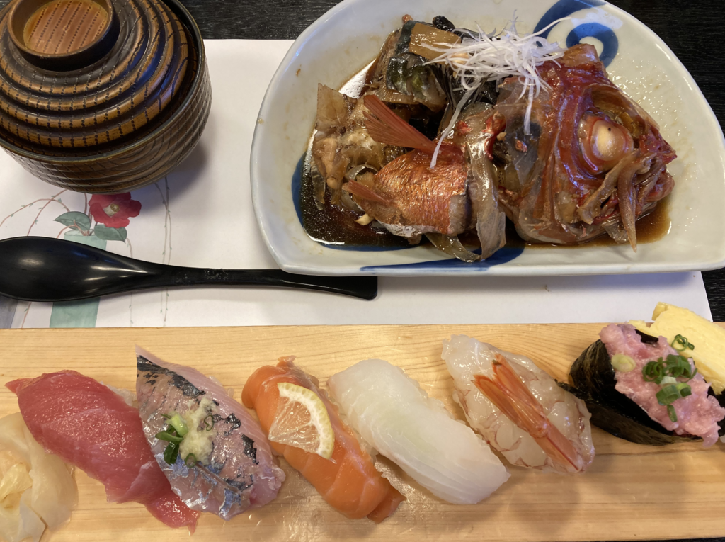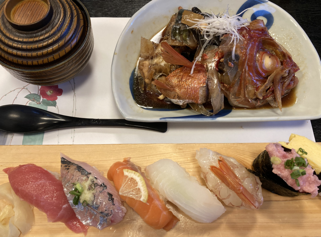 今回、私がメニューの中から選んだのは「すしとアラ煮御膳」。写真にもあるとおり、鮮やかな赤い身が印象的なアラ(=魚のあら)を使った煮付けがメインのセット。