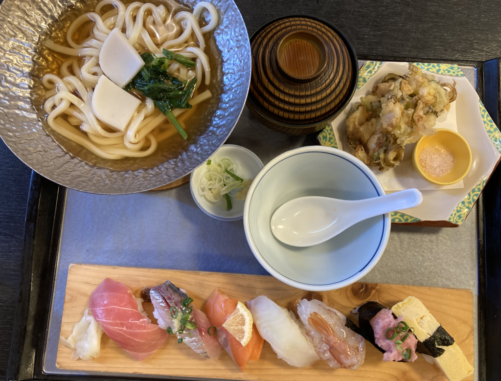 香ばしいかき揚げうどんと握り寿司の温冷バランスが心地よい、ほっと和む組み合わせです。
