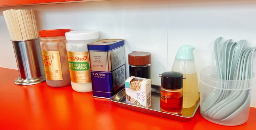 半分食べたあたりで卓上のコショウを数振り。香りと辛味がプラスされ、スープの輪郭がよりはっきりします。 - 最後ににんにくを投入して一気にパンチを効かせる