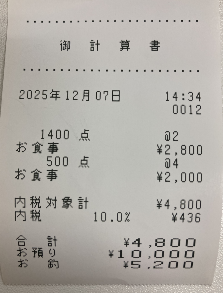 - 会計合計:¥4,800(料理¥2,800 + 日本酒¥2,000/領収書参照)