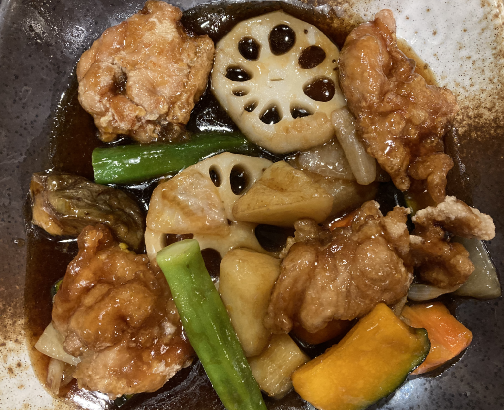 若鶏は4個、皮目に軽い焼き目がありつつ、黒酢あんがしっかりと絡んでおります。