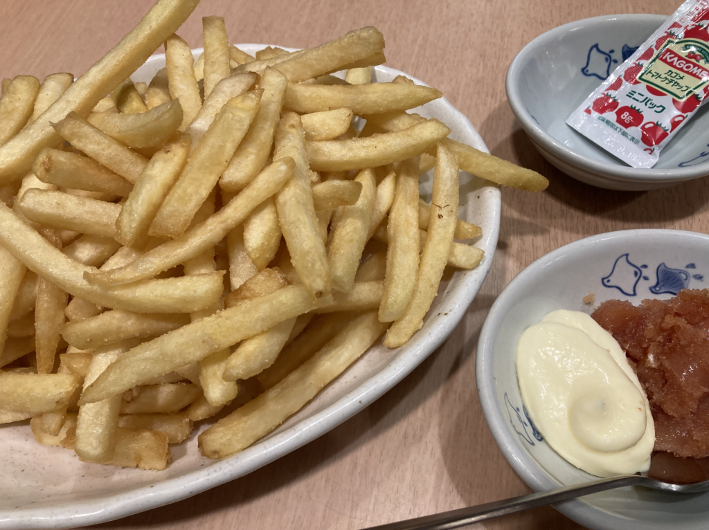 クーポンを使って山盛りで頼んだポテトフライは、明太子マヨの塩気とコクでアルコールのつまみにちょうど良い役割。