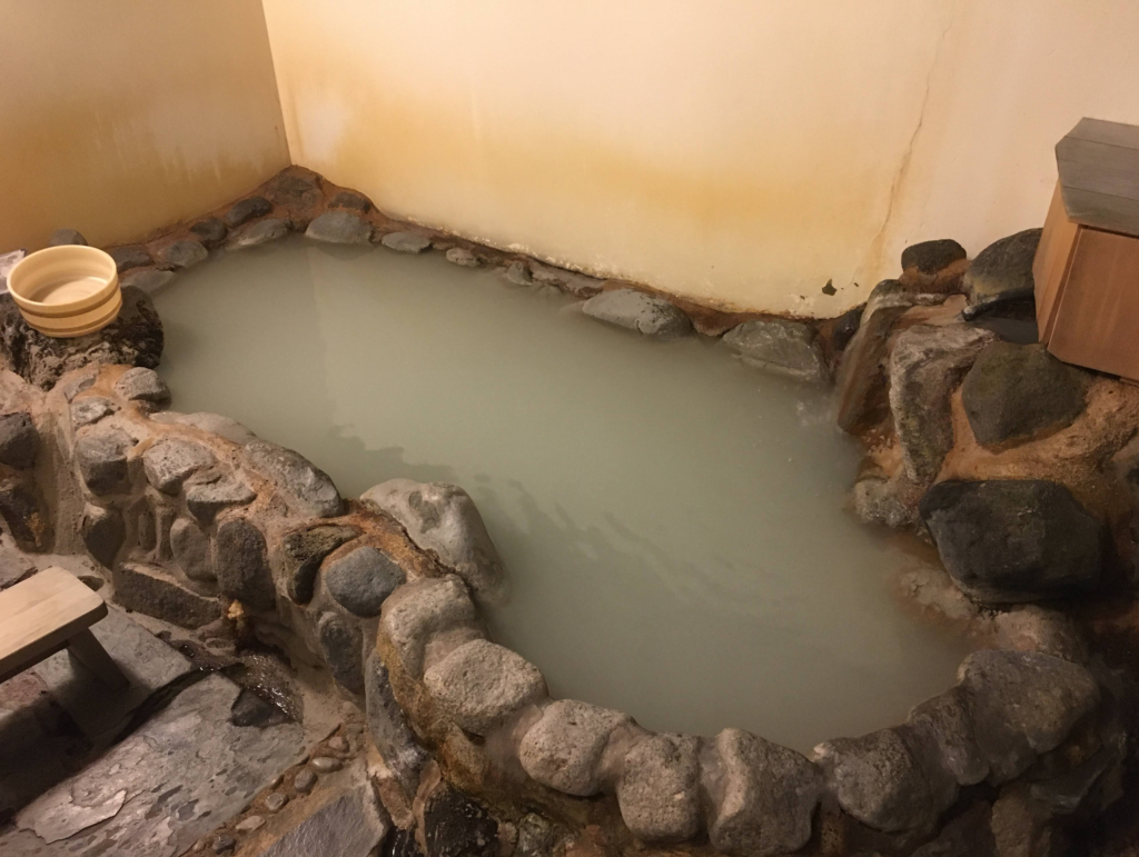 宿泊客にとって「温泉付き客室」は最大の味方。大浴場はコロナ禍で閉鎖されていたが、私はそれを問題だとはまったく感じなかったのです。「泉質」が良いことはもちろん、客室に温泉が付いているという事実が、宿全体の満足度を最初から押し上げていたから。部屋へ入るや否や浴衣に袖を通し、客室内の湯をそっと開きました。