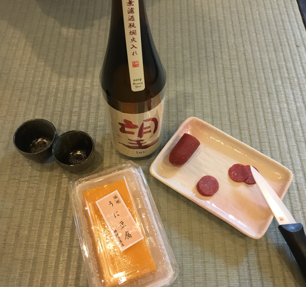 「望」を湯上がりに傾け、腸詰屋で買ってきたアテと合わせる。
