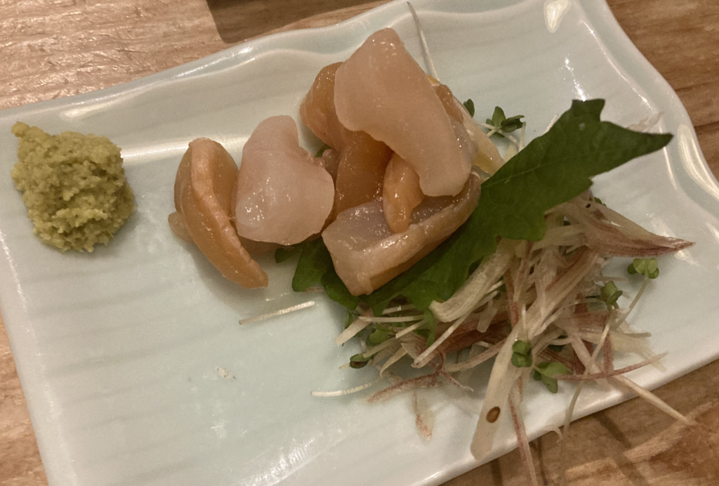 いわゆる「貝柱の刺身」と呼んでよいのか迷う一品。とにかくコリコリ。