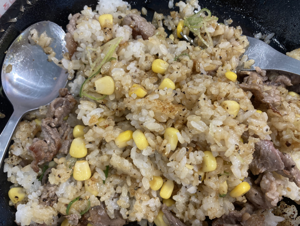 鉄皿の中央に盛られたライス。その上に、コーン、ネギ、粗挽きブラックペッパー。周囲を囲むように配置された薄切りのビーフ。