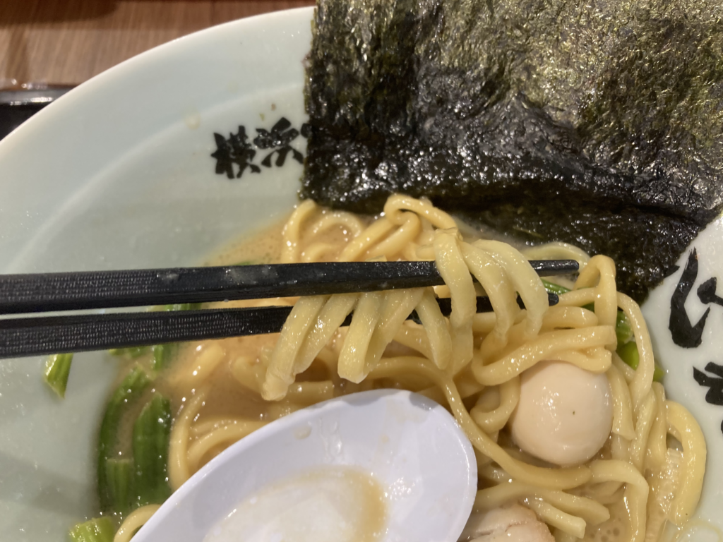 家系ラーメンらしい、しっかりした醤油感と豚骨の厚みに、麺がよく絡む。