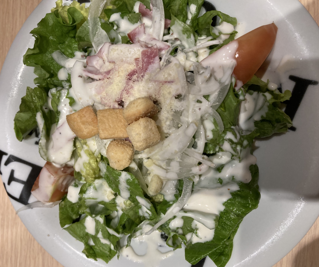 レタスを中心に、ベーコンやクルトンが入り、ドレッシングはしっかり濃いめ。