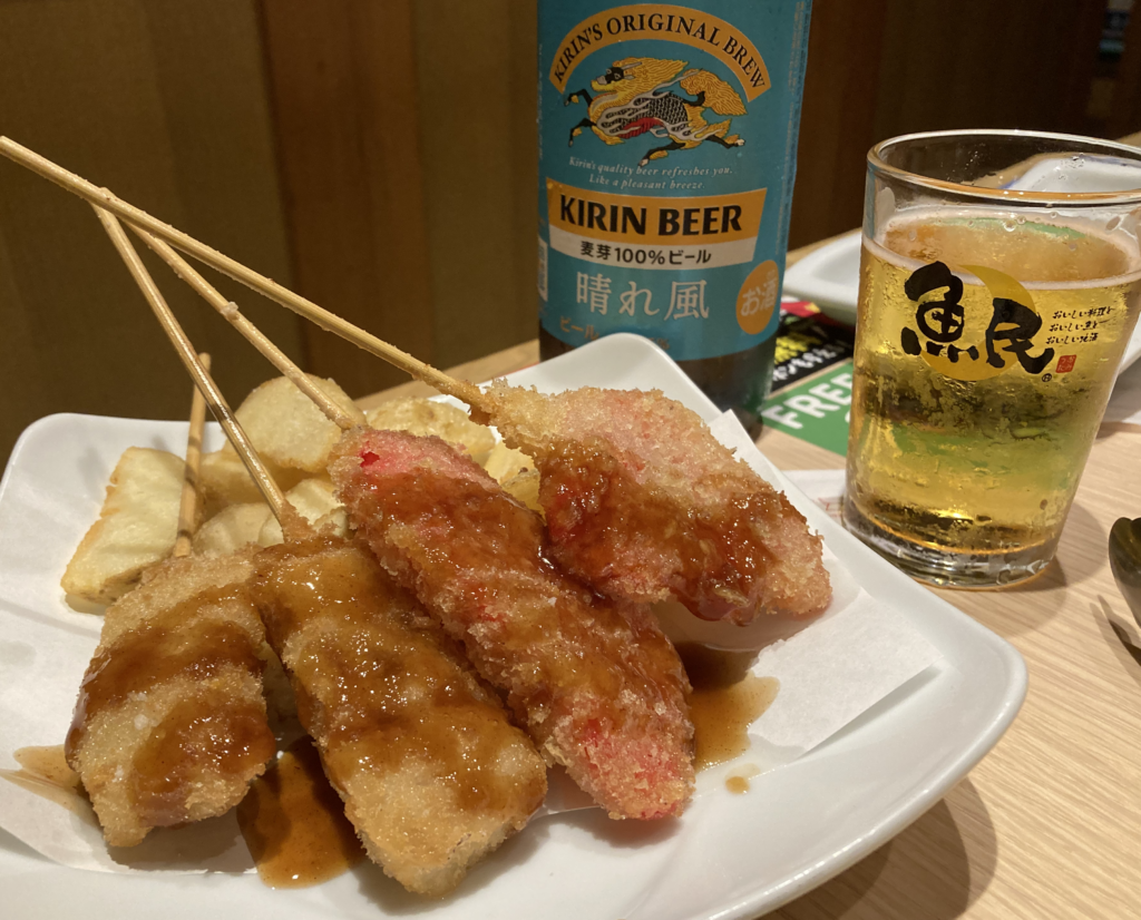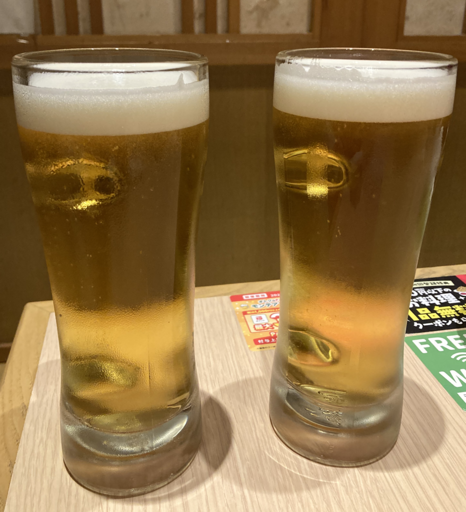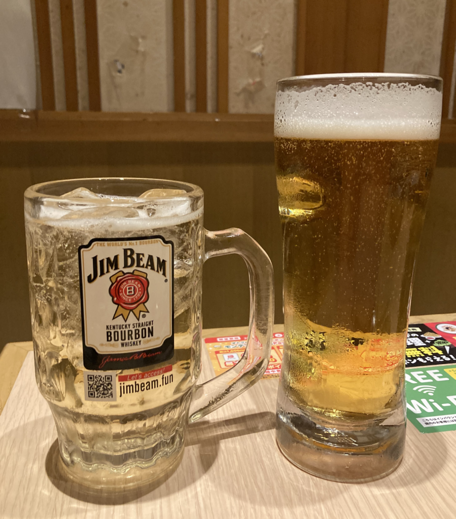 今回は、生ビール → 瓶ビール → ジンビームハイボールという流れを主に、楽しみました。