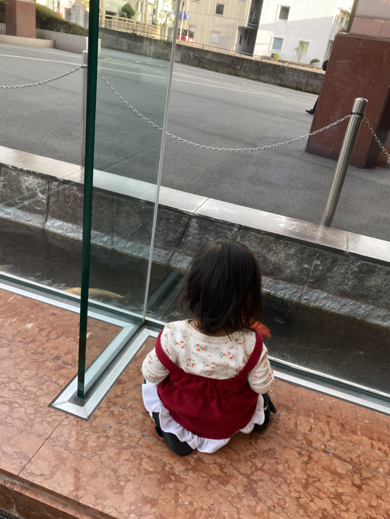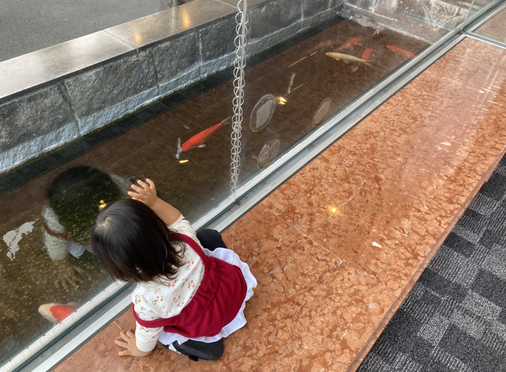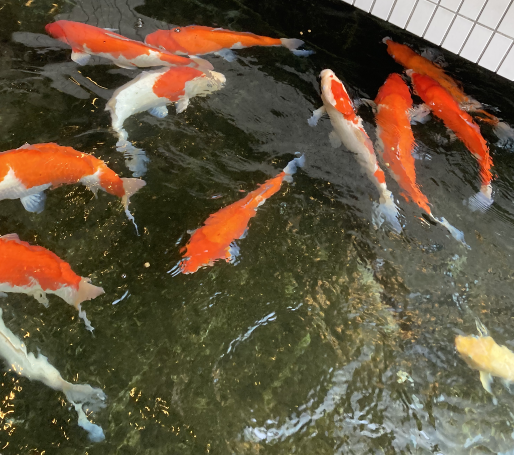 ラウンジの外には池があり、鯉が泳いでいます。