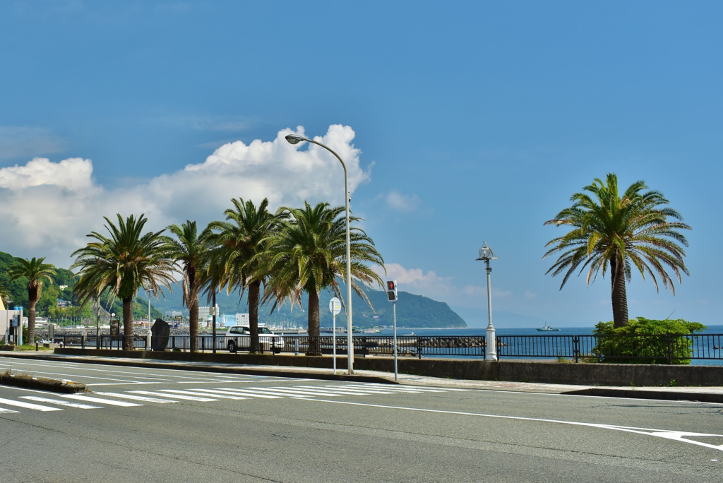 ヤシの木、青い空、海沿いの遊歩道。伊東でありながら、どこか南国のリゾート感がある道。