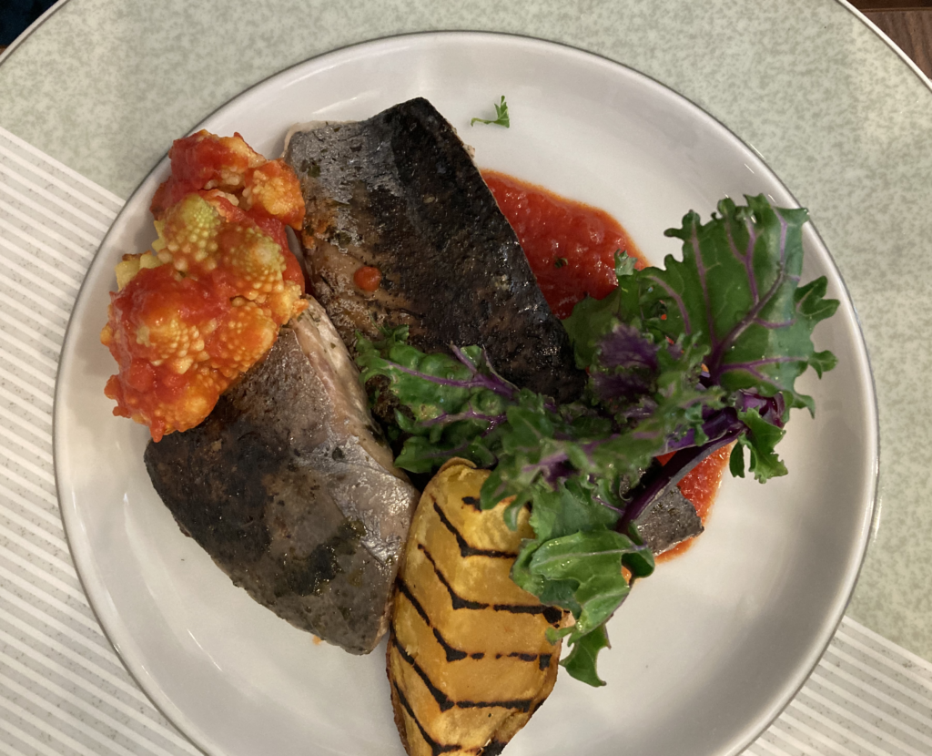 ② 小田原ソウダカツオのスパイス焼き・大井町ロマネスコのトマトソース(妻)