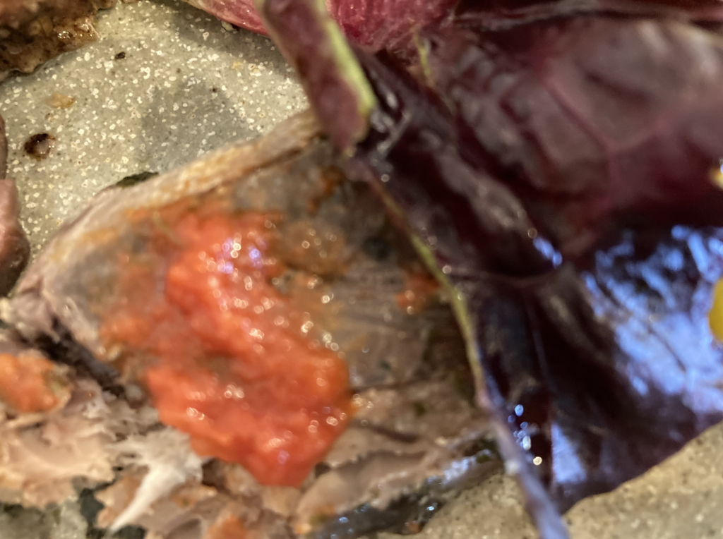 小田原のソウダカツオ を使い、スパイス焼きにした一皿。そこに大井町のロマネスコを使ったトマトソース。