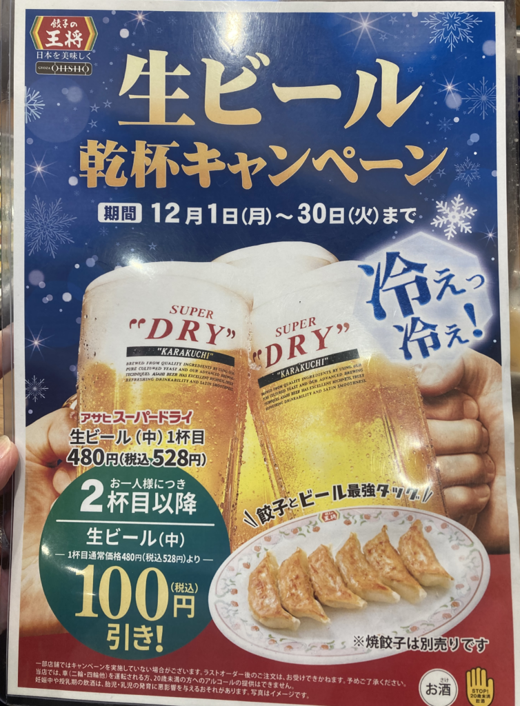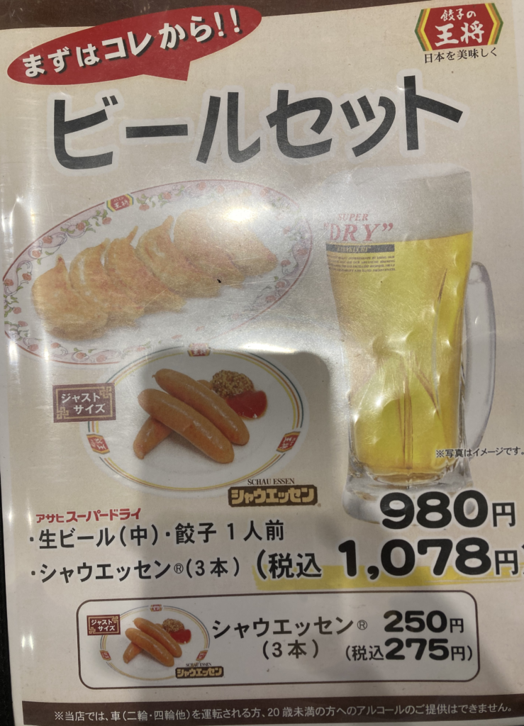 餃子の脂とビールの炭酸は鉄板の組み合わせであり、餃子の王将ではその相性が価格と共に設計されています。