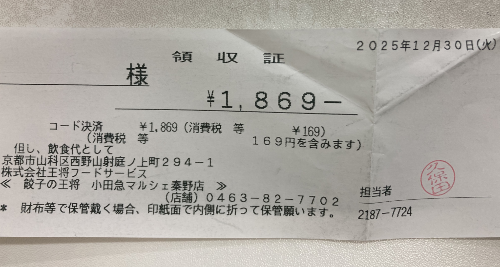 王将アプリのクーポン使用による割引もあり、「旨い × 安い × 早い」という三拍子が成立しました。
