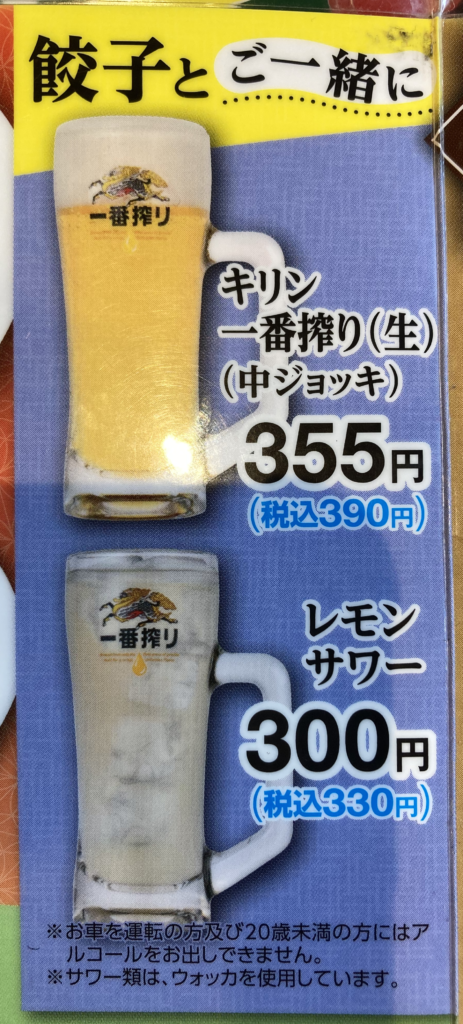 - 餃子とビールの定番セットは昼酒に最適。