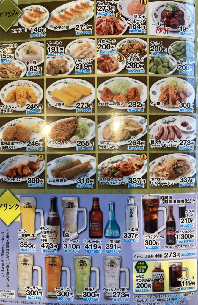 - 日高屋での昼飲みセットづくり(アテ+ドリンクの定番構成)。