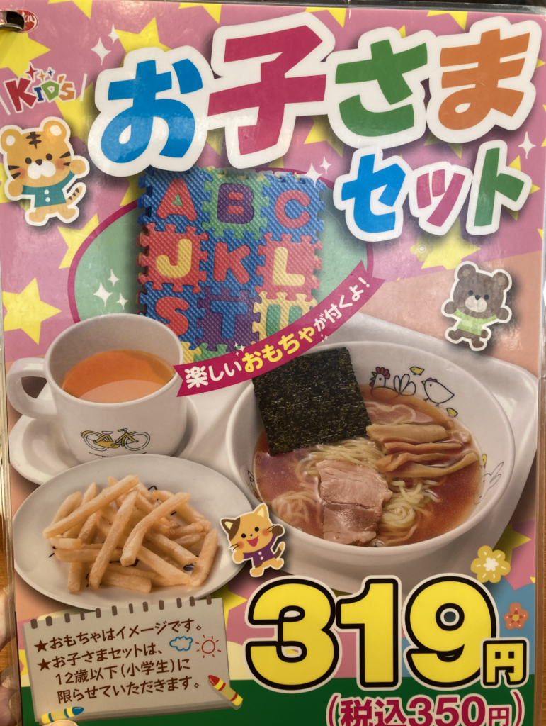 - お子様セット(ミニラーメン・ポテトフライ・オレンジジュース・おもちゃ付き) … 350円