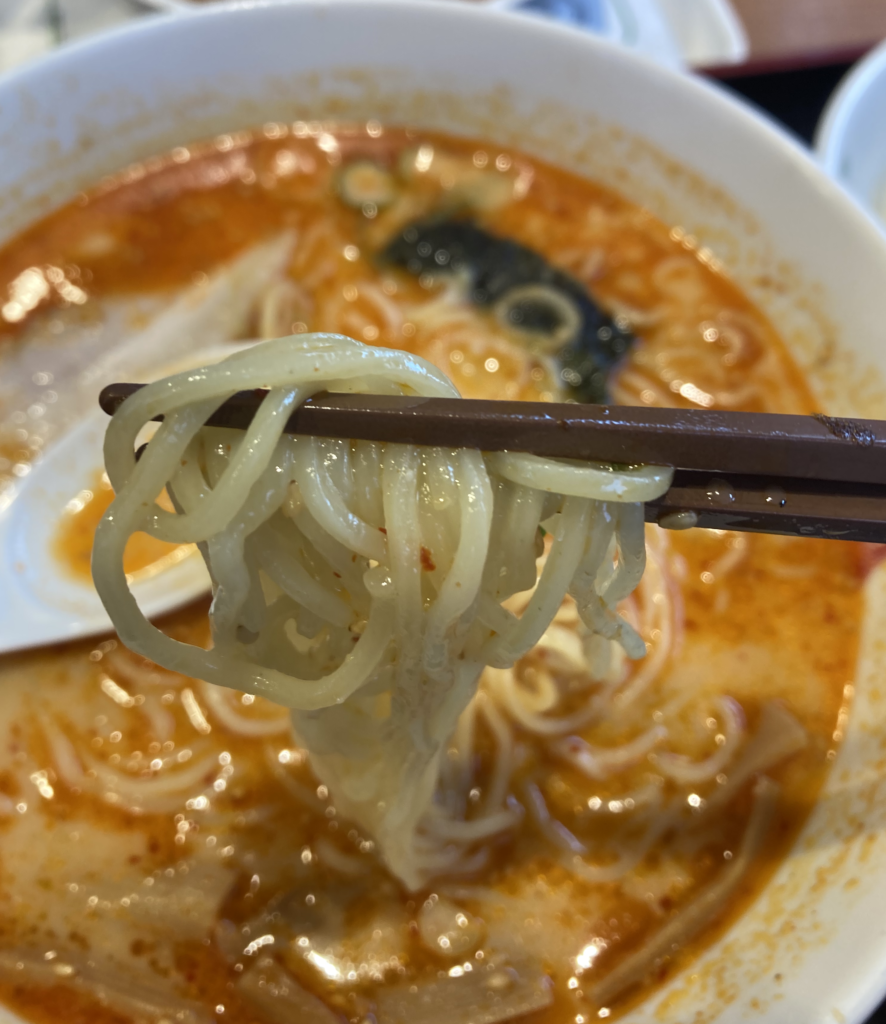 麺はスープとの絡みが良好。豚骨スープの旨味を適度に受け止め、ピリ辛味との相性も良い、バランスの取れた仕上がりです。