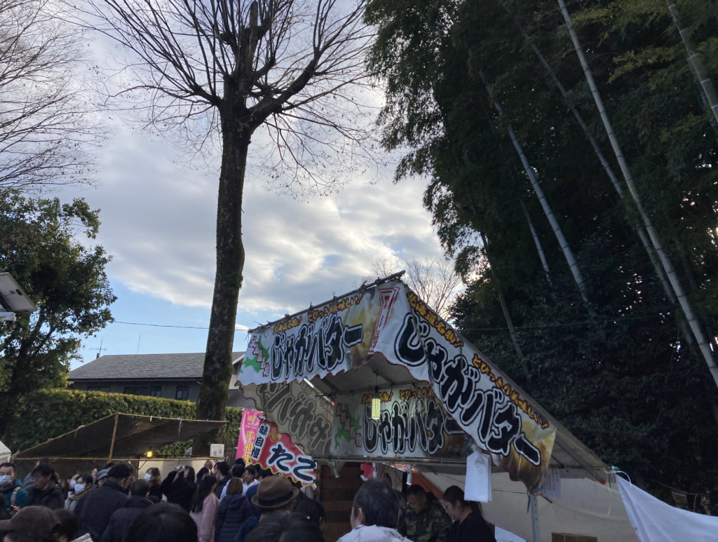 参拝を済ませ、境内にあった屋台でじゃがバターを味わい、幸せ気分。