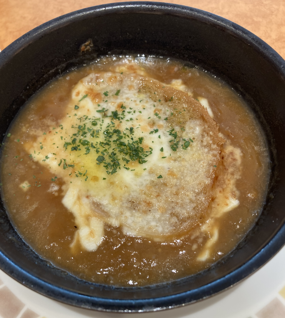 たまねぎをじっくり煮込んだスープで、玉ねぎの甘みとコクが前に出てくるスープ。