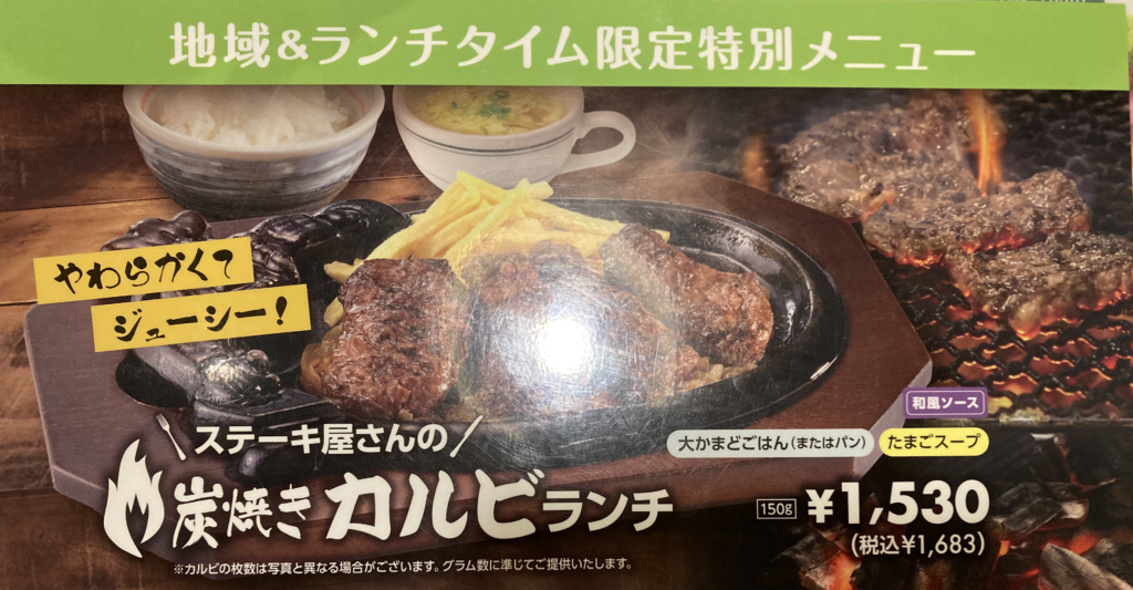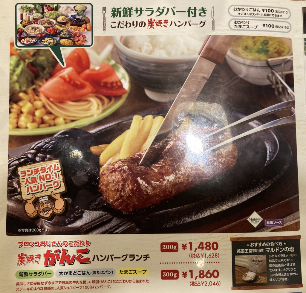 この体験を経て、メニューにある「炭焼きがんこハンバーグ&炭焼きカルビランチ(2,178円)」が、次回の有力候補になったのは自然な流れでした。