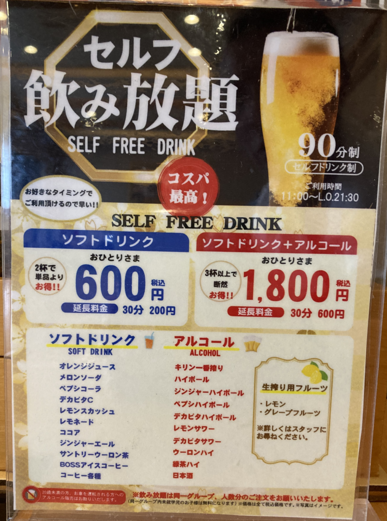 前回とても満足度が高かった、90分制のセルフ飲み放題。